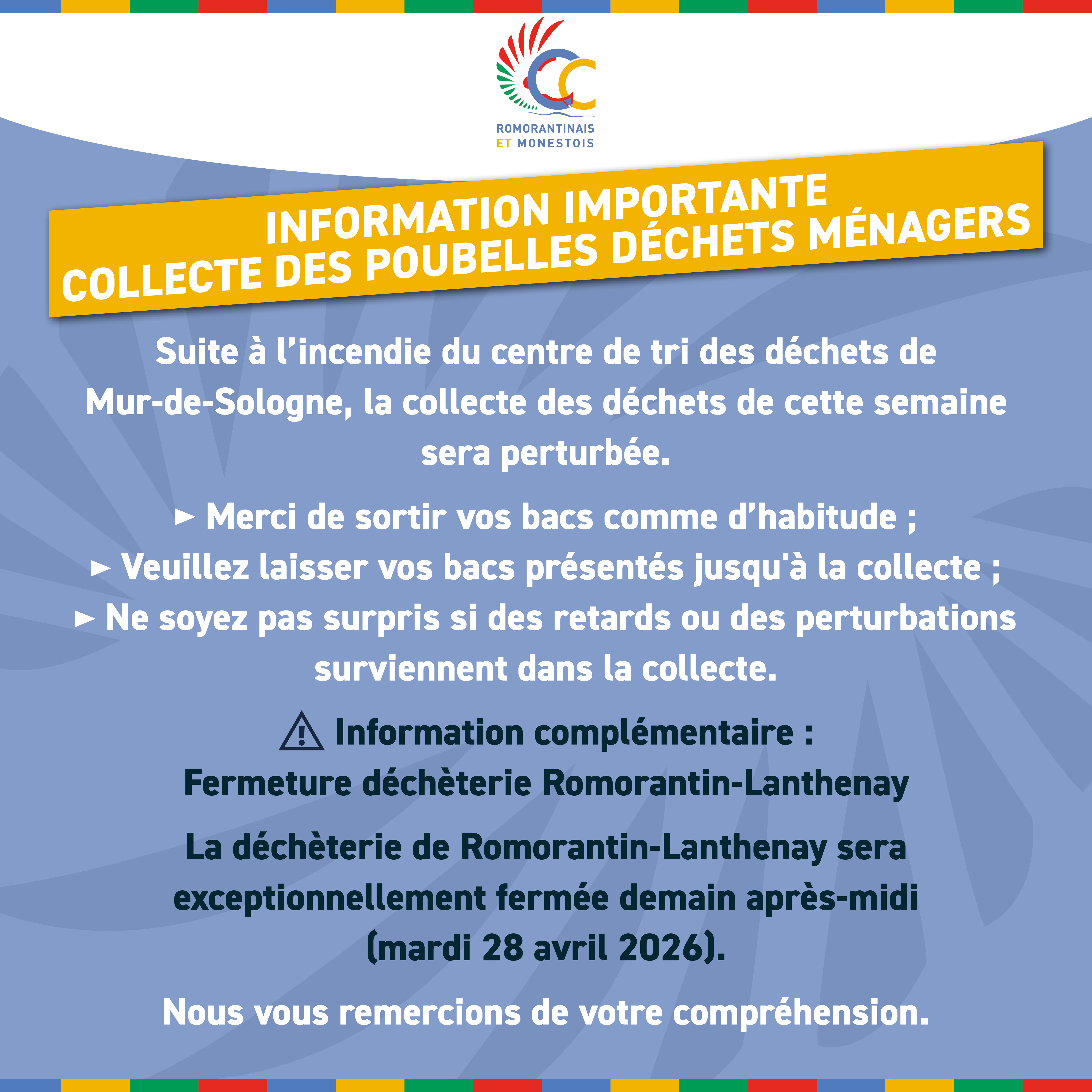 Suite à l’incendie du centre de tri des déchets de Mur-de-Sologne, la collecte des déchets de cette semaine sera perturbée.