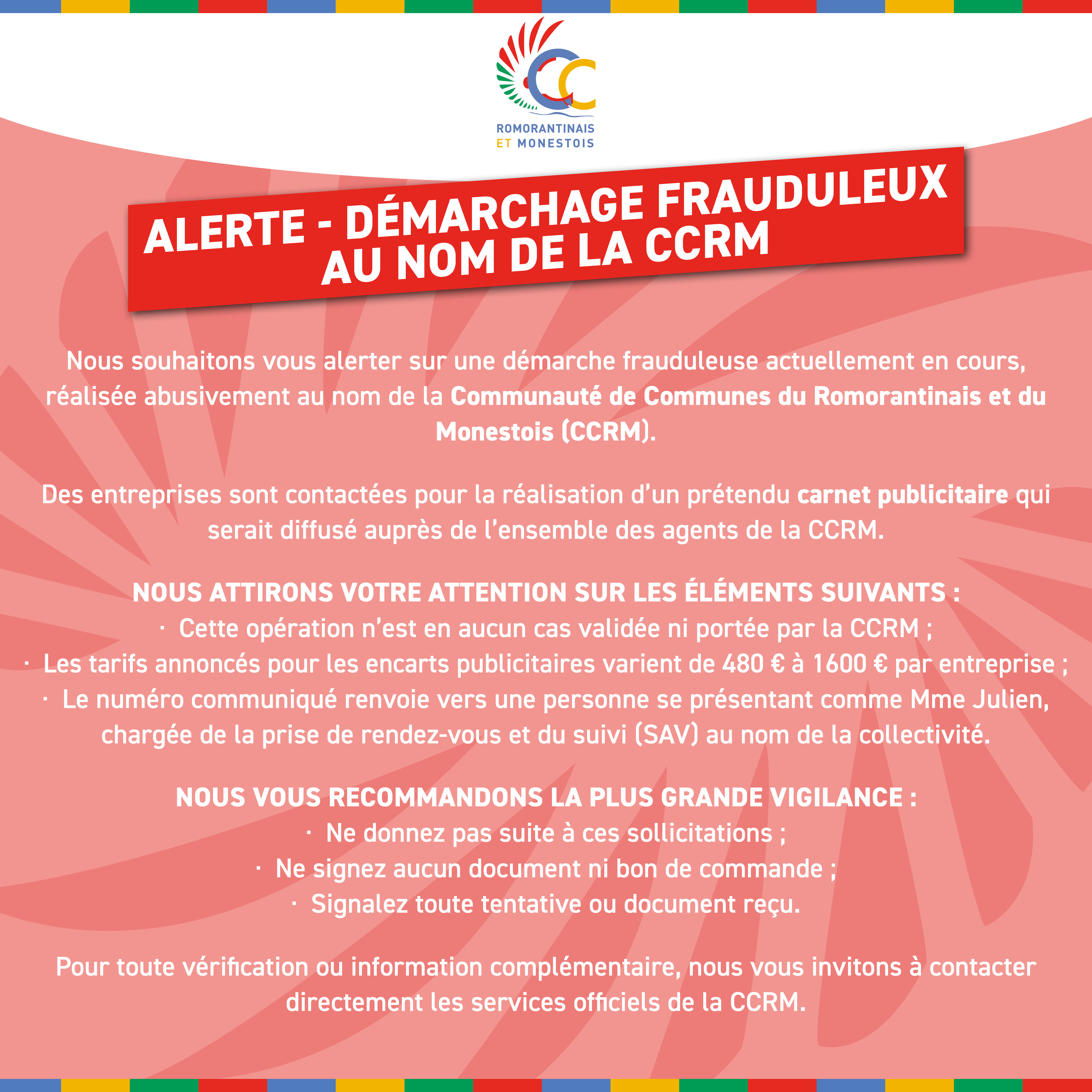 Nous souhaitons vous alerter sur une démarche frauduleuse actuellement en cours, réalisée abusivement au nom de la Communauté de Communes du Romorantinais et du Monestois (CCRM).