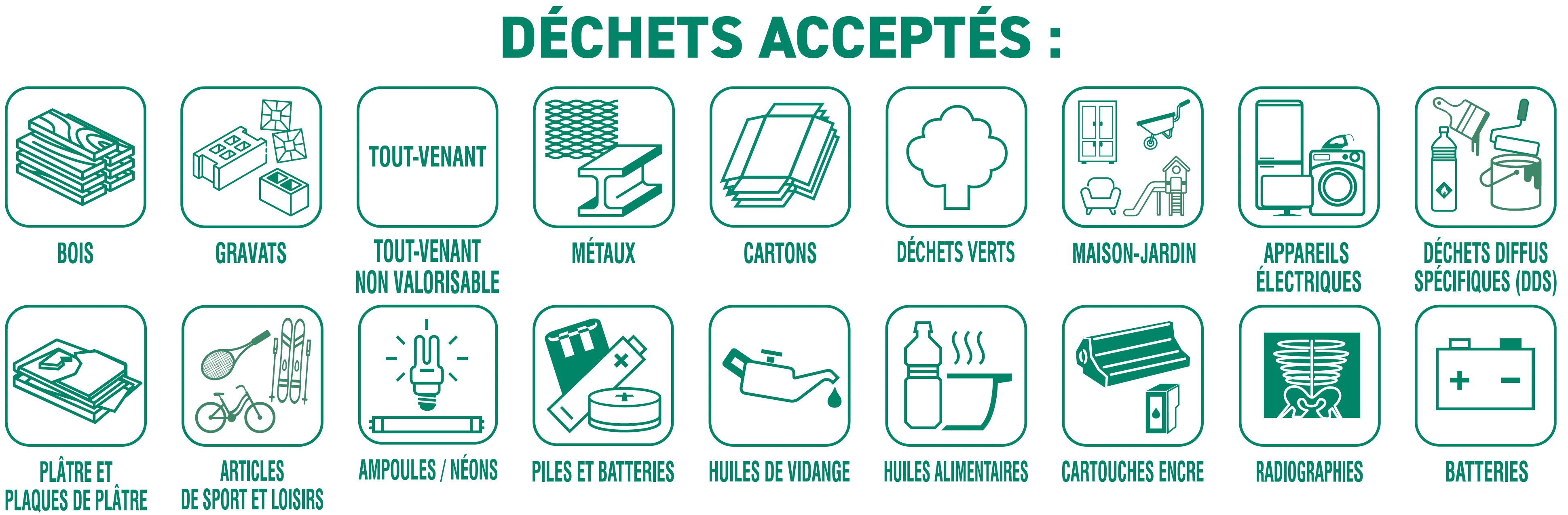Déchets refusés : Amiante – Plaques de fibrociment – Extincteurs – Bouteilles de gaz – Déchets médicaux – Ordures Ménagères – Éléments de carrosserie de véhicules – Cadavres d’animaux – Produits explosifs / radioactifs – Déchets anatomiques ou infectieux – Pneus