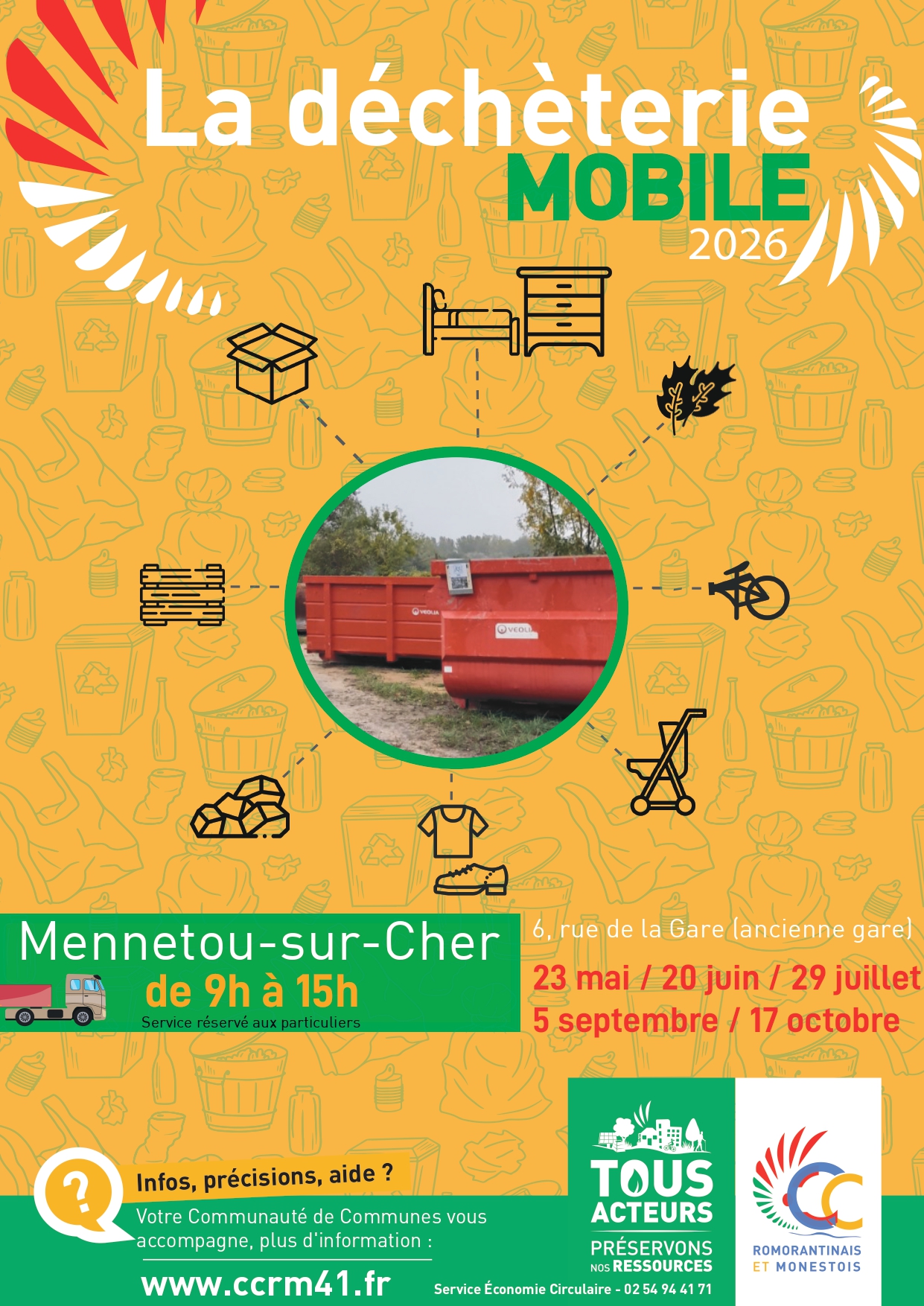 Calendrier des jours d’ouverture de la déchèterie mobile, pour l’année 2026 : ♻ Prochaines ouvertures de la déchèterie mobile à Mennetou-sur-Cher (ancienne gare, 6 rue de la Gare) : 📅 […]