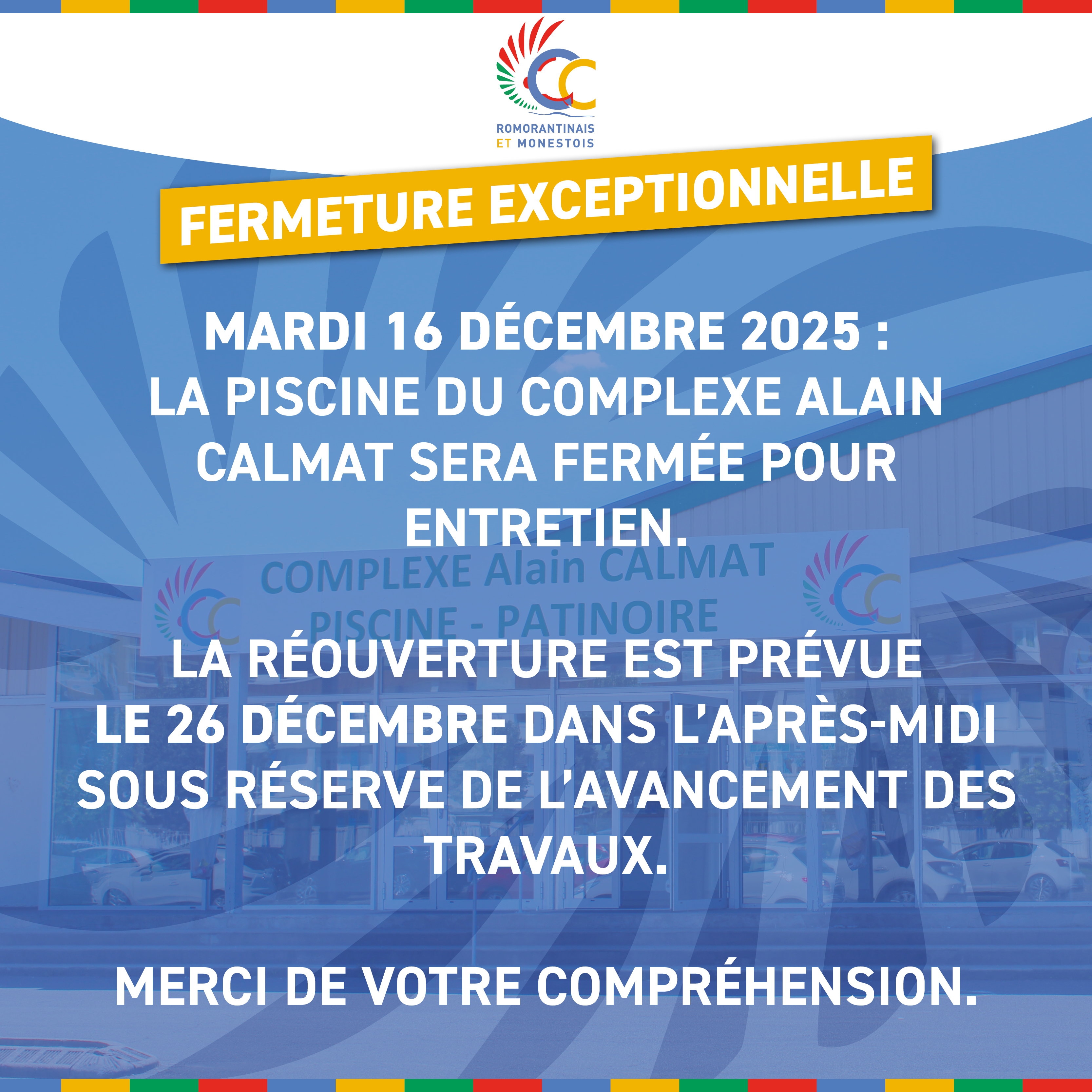 Mardi 16 décembre 2025 : la piscine du complexe Alain Calmat sera fermée pour entretien.