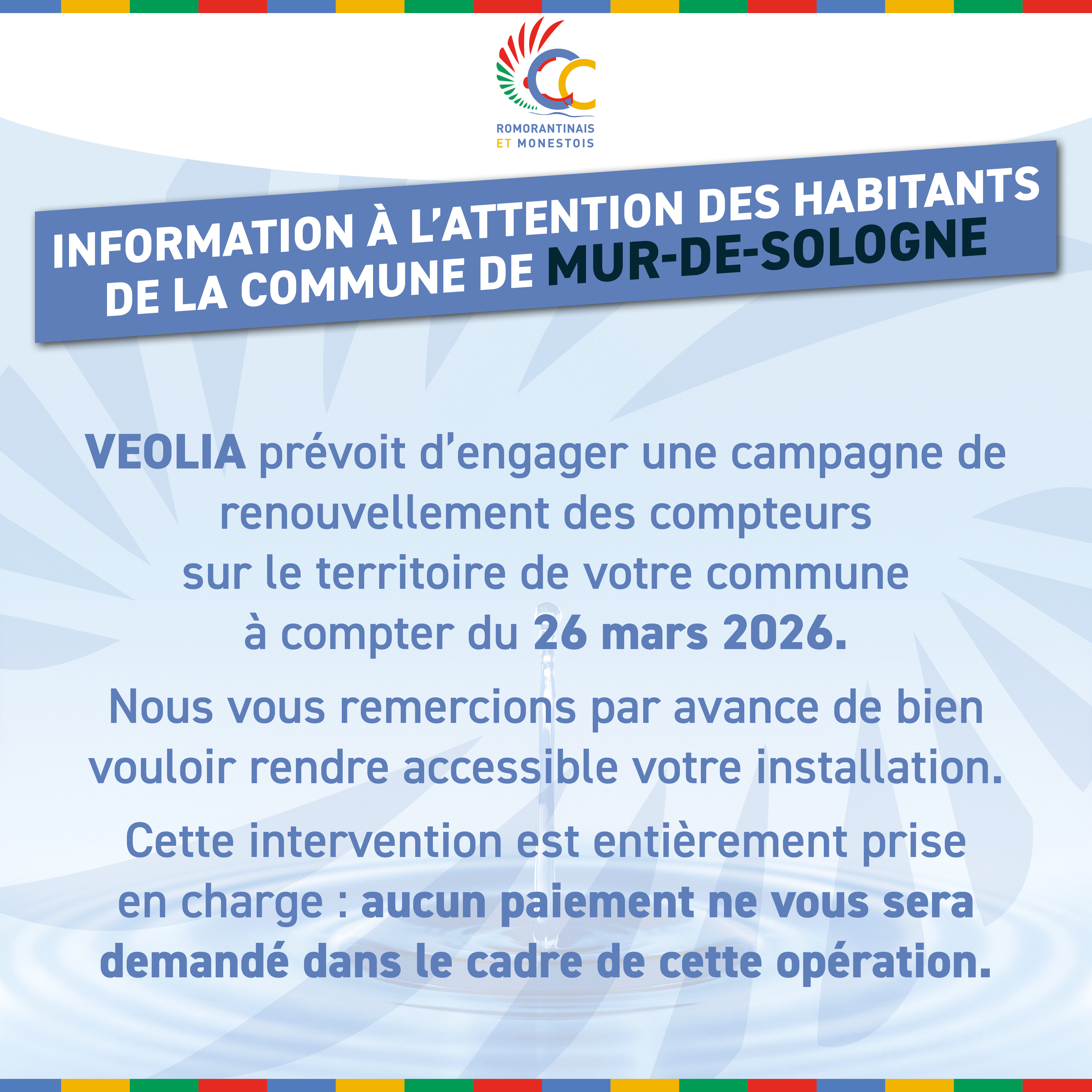 VEOLIA prévoit d’engager une campagne de renouvellement des compteurs sur le territoire de votre commune à compter du 26 mars 2026.