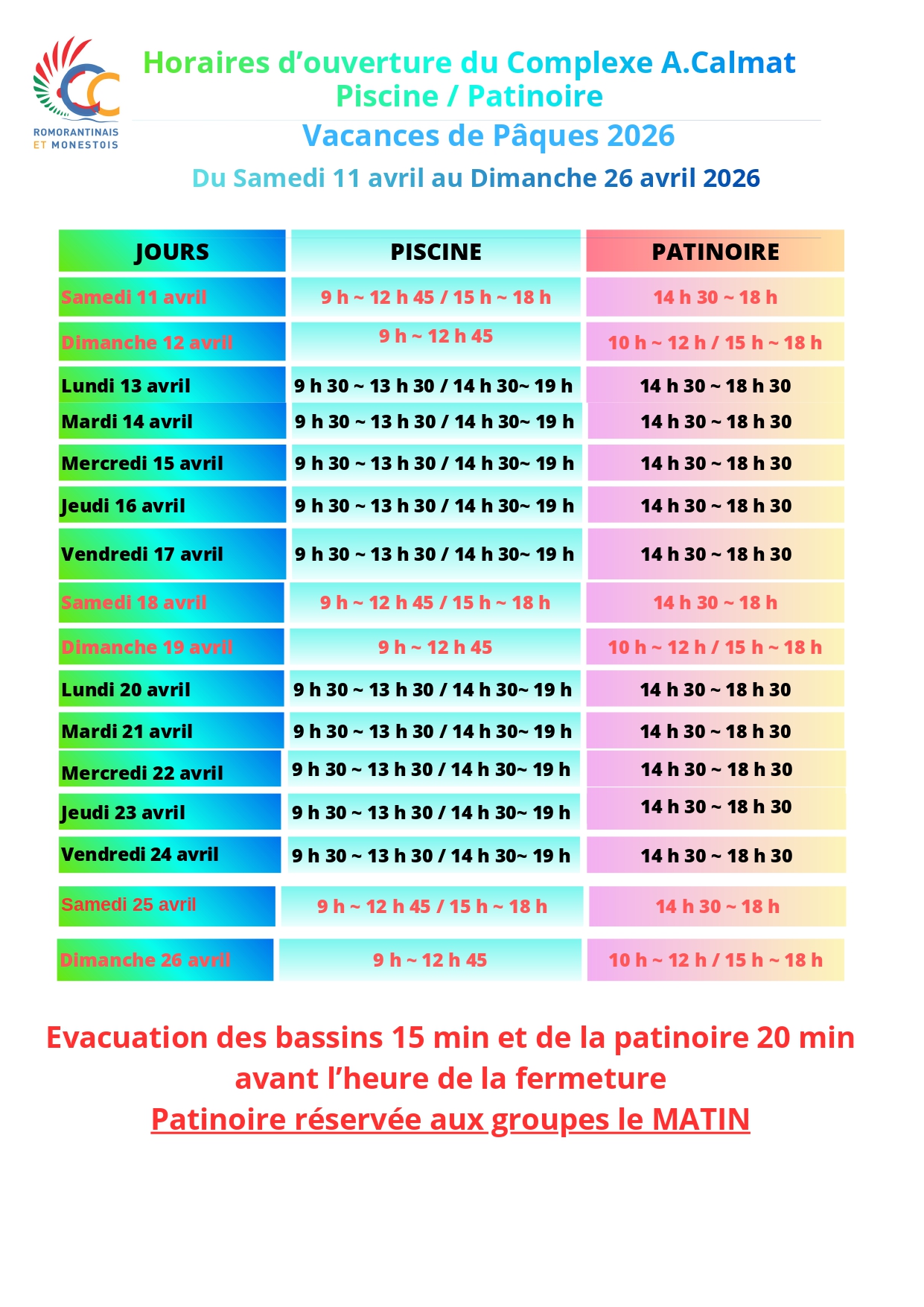 Profitez de la piscine et de la patinoire du samedi 11 avril au dimanche 26 avril 2026.